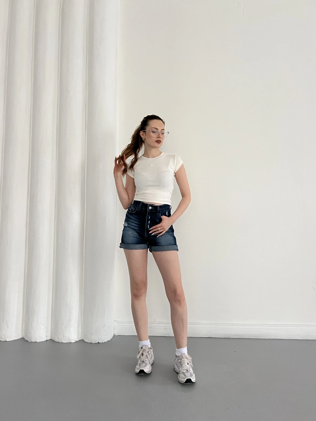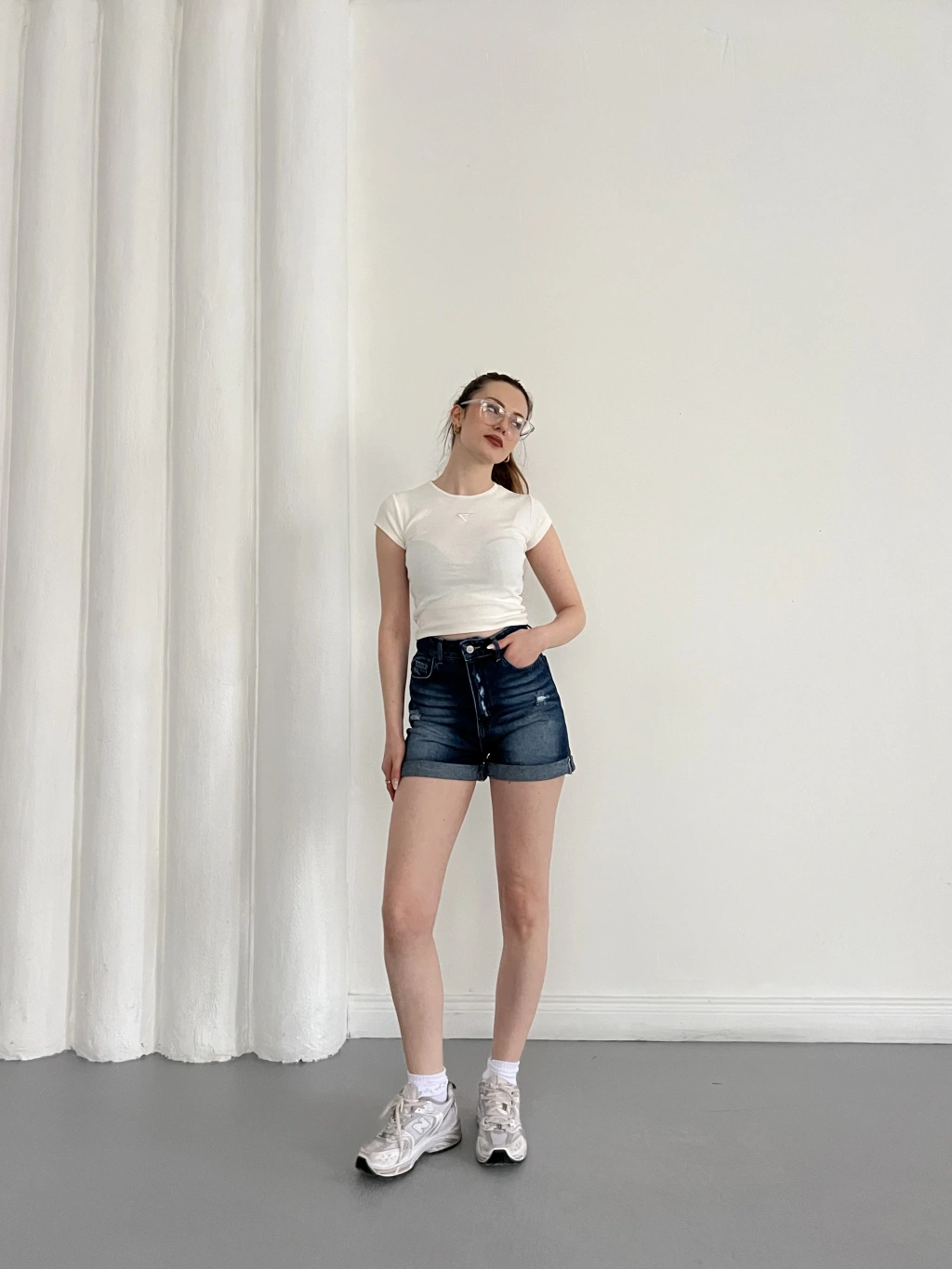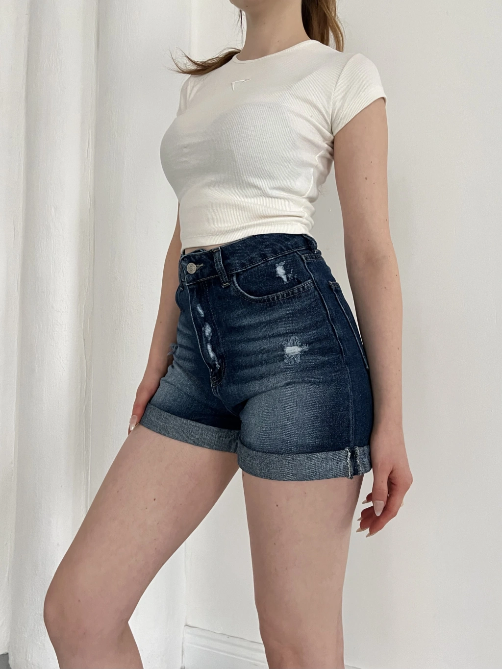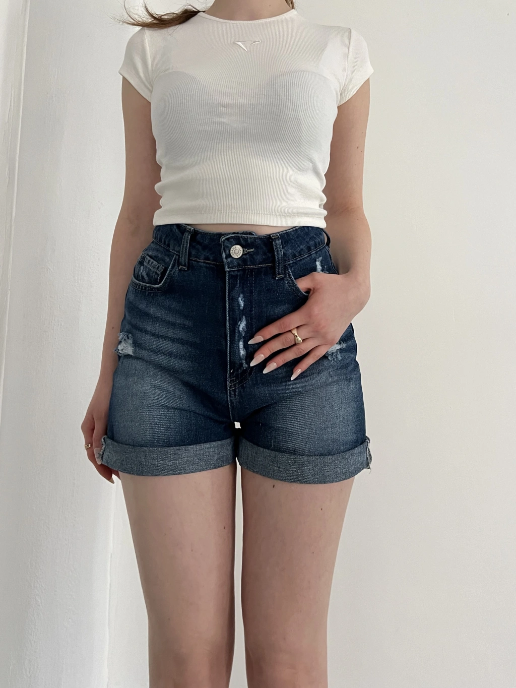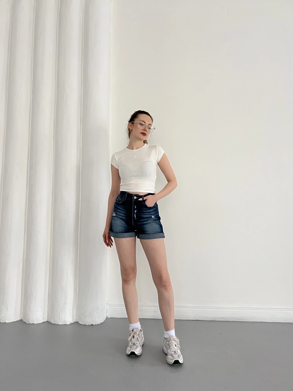 Yıkamalı Yırtık Desenli Denim Şort Lacivert