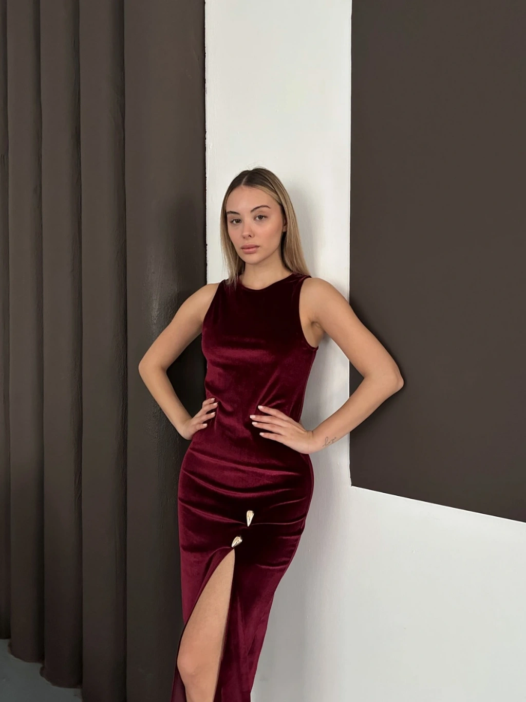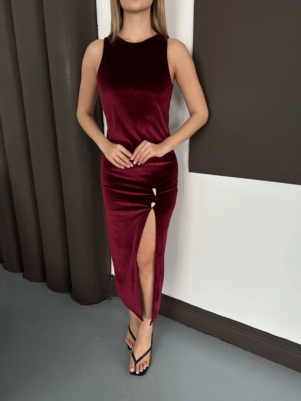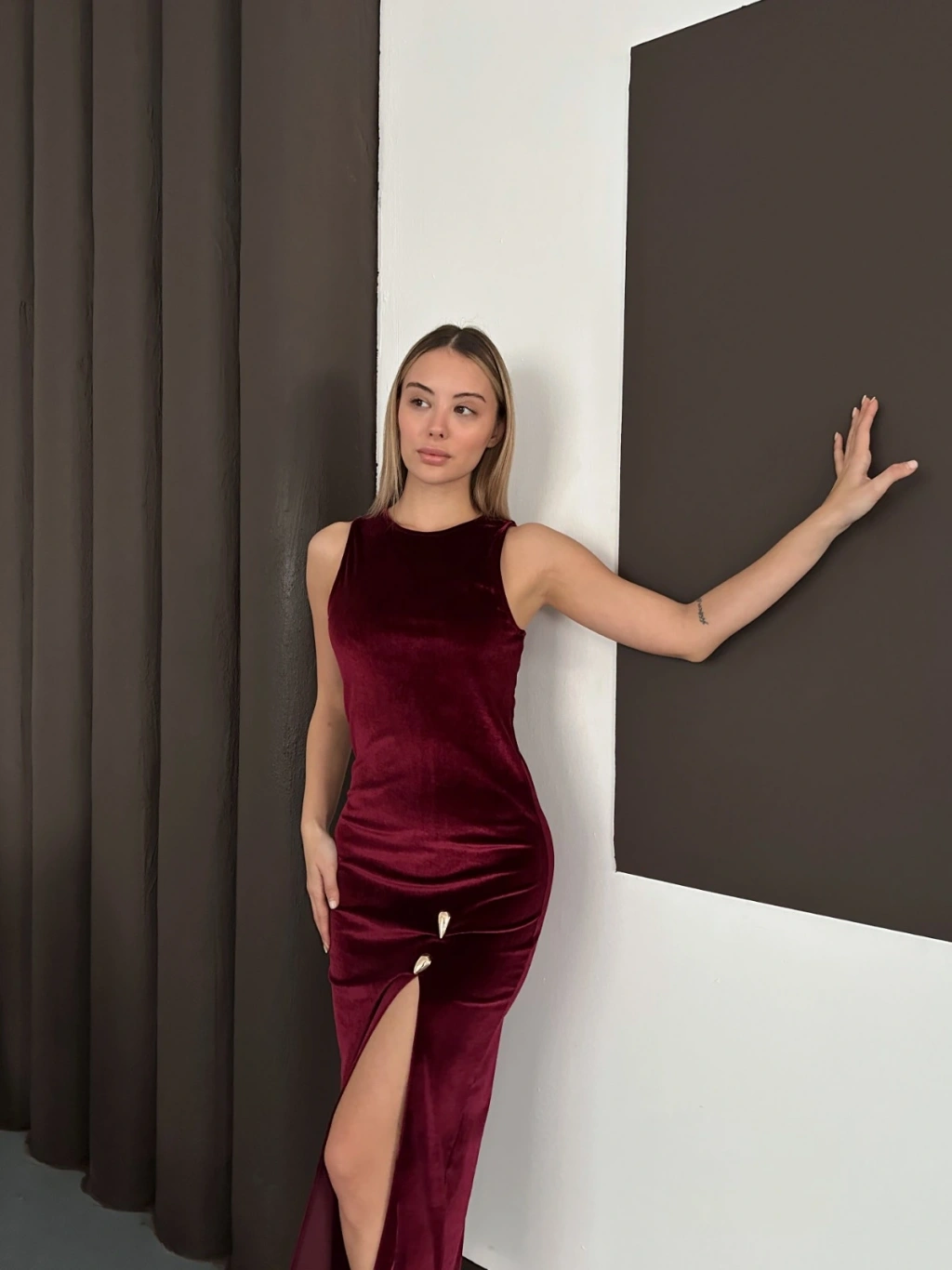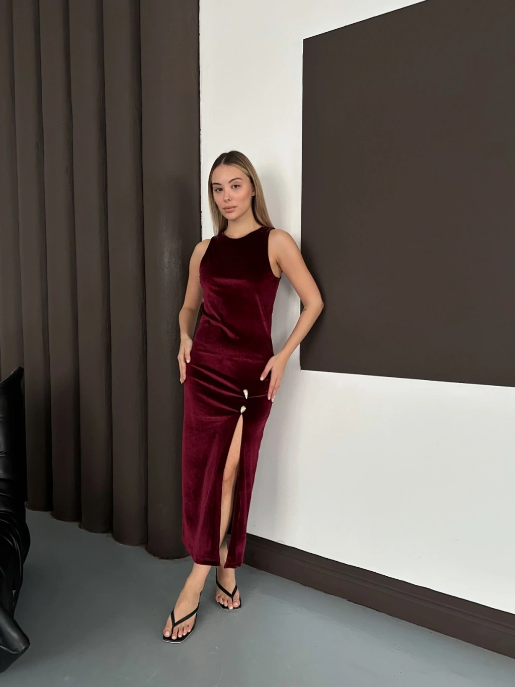 Yırtmaç Detaylı Aksesuarlı Kadife Elbise Bordo