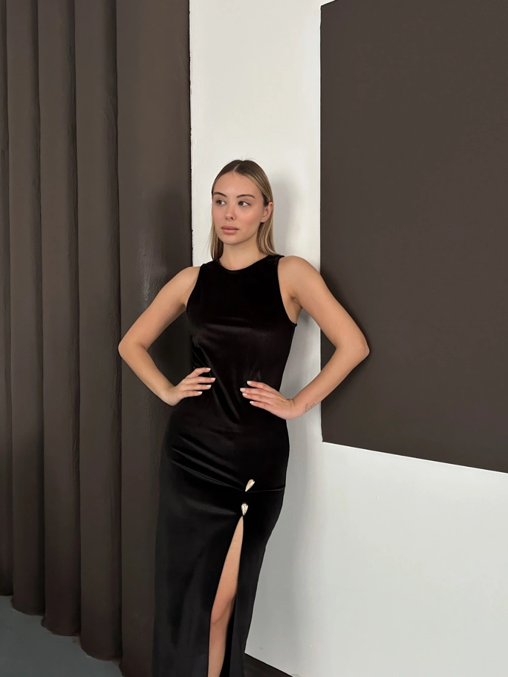 Yırtmaç Detaylı Aksesuarlı Kadife Elbise